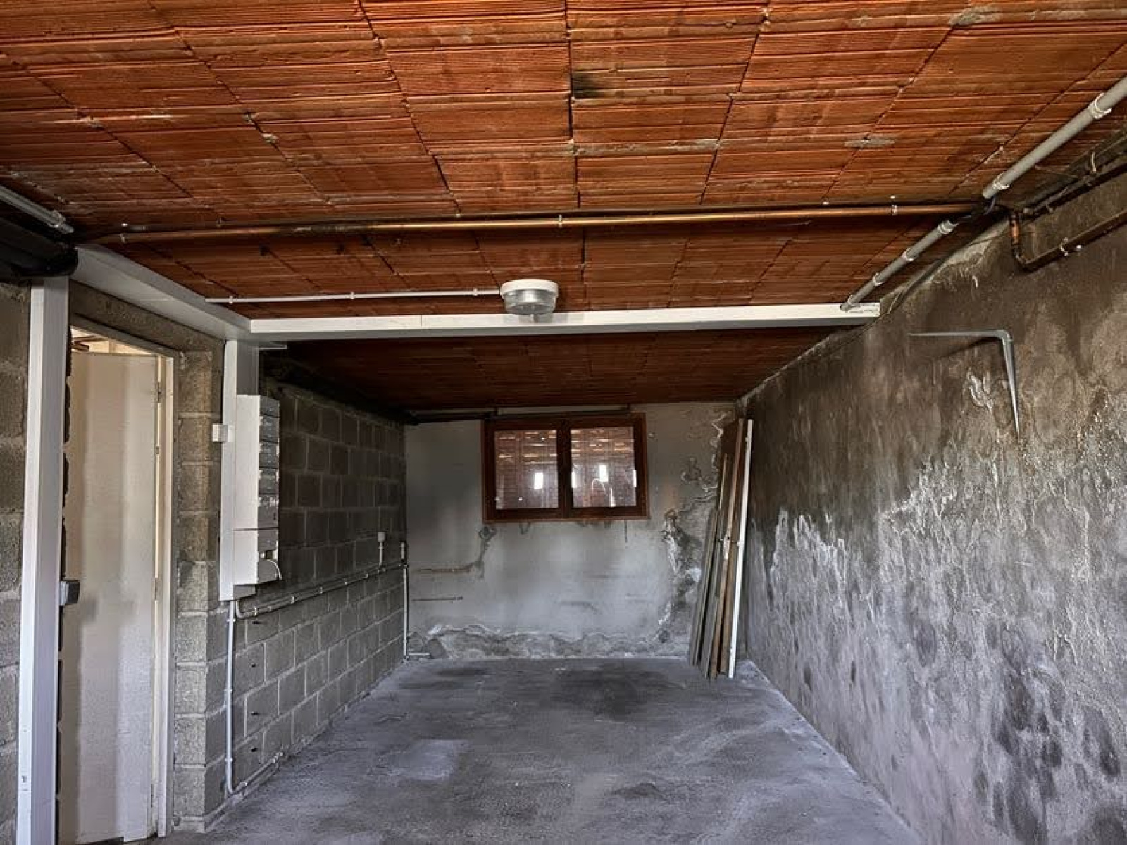En rez-de-jardin : entrée, deux chambres, wc indépendant, garage et buanderie. Cave en-dessous.